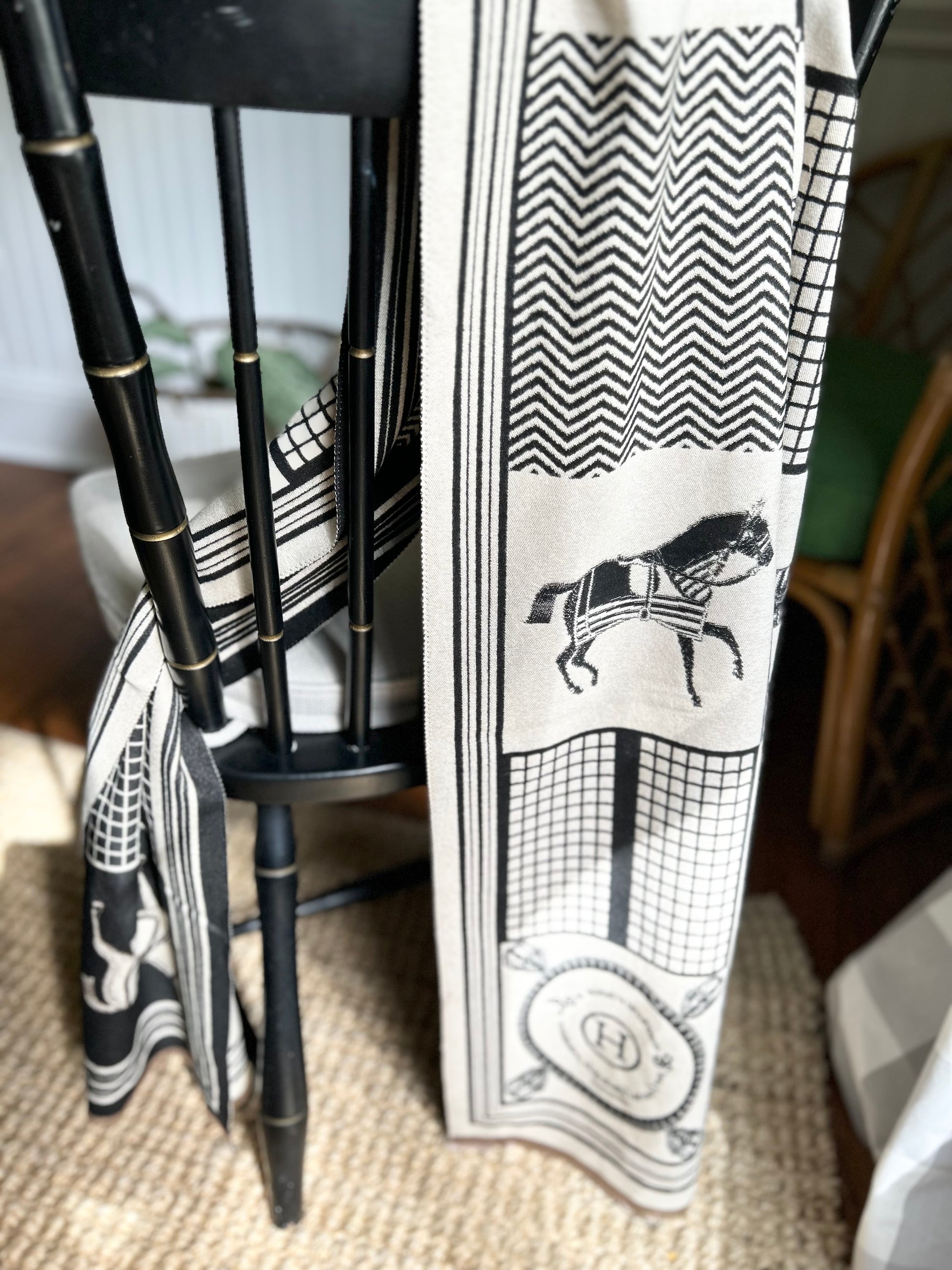 Stunningly soft and lightweight throw in a beautiful Equestrian print. Wear it as a wrap on chilly evenings or dress up a bed or chair with it! Beautiful black and cream colors make it an instant classic!!